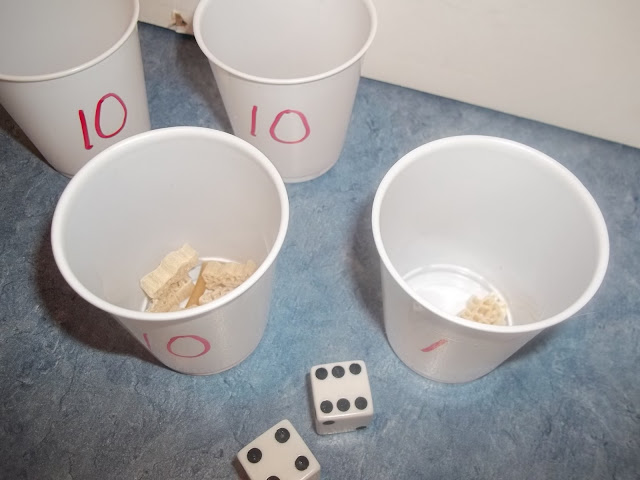 Then, build the numbers in the cups. For sixty four, place 10 pieces of macaroni in six cups (60) and one macaroni in four number one cups (4).